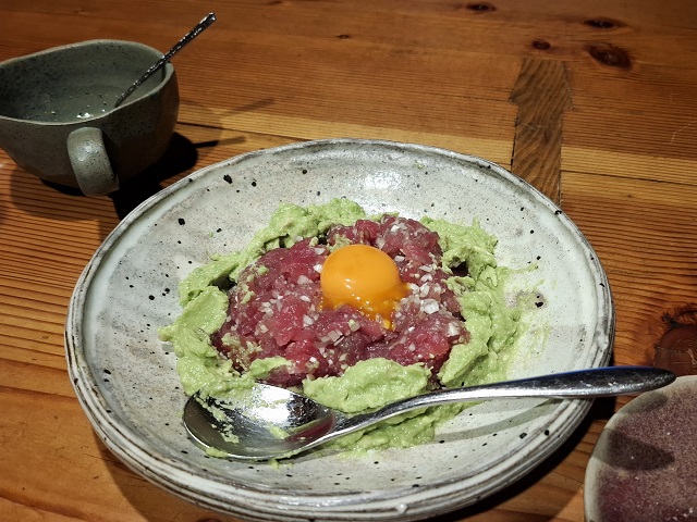 鮪アボカドユッケ。山葵オリーブオイルソースで食べます。みじん切りじゃ、筋肉痛にはならないよね。