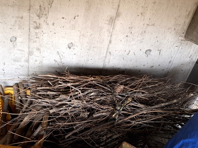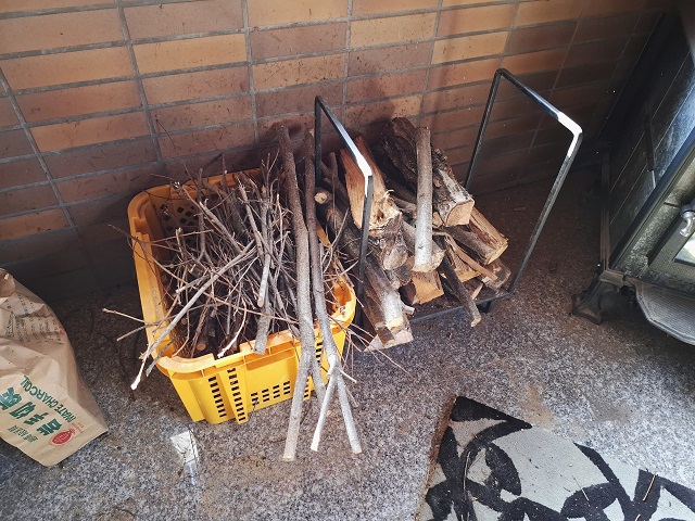 黄色い箱に入っているのが、焚きつけ用の小枝。鋏で歯が立たなかった2本は、夫に任せます。
