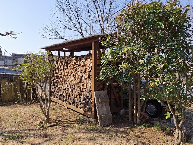 庭のあっちこっちにある薪小屋から、まずはウッドデッキに運んで。