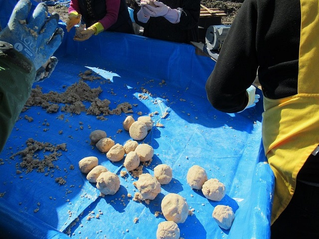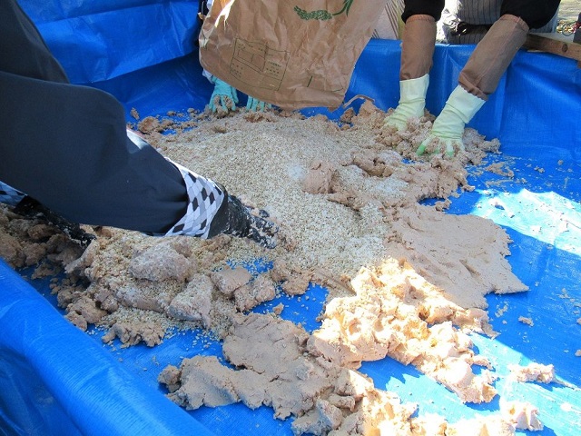 これは、去年の写真です。今年は当日、雨、あられ、雪で、味噌造りもがんばったので、写真は1枚も撮れませんでした。混ぜて、混ぜて、混ぜて。
