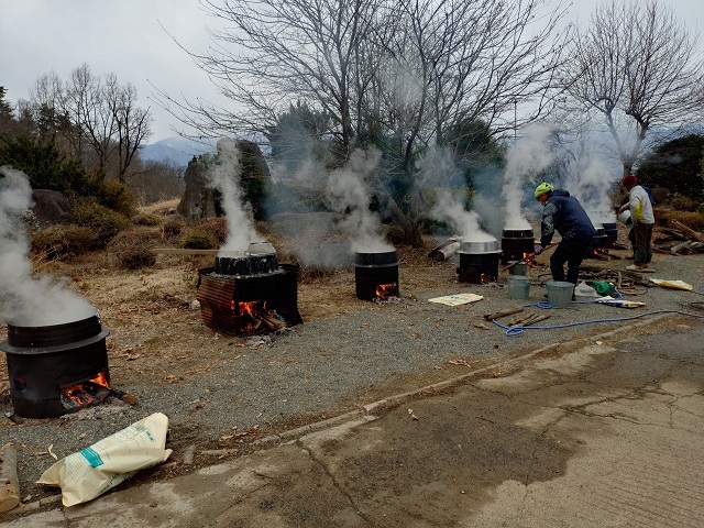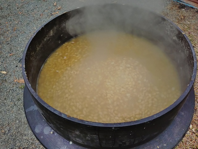 前日準備の風景です。夫は3日間の重労働。1日目の大豆を量ったり洗ったりの準備から2日目の竈に火をつけ大豆を茹でる作業も、すべて引き受けていました。