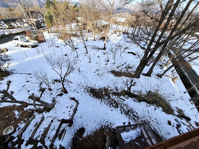 庭は、斑雪です。