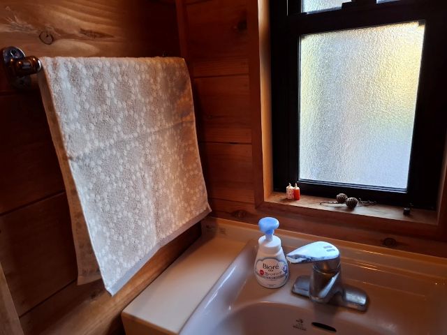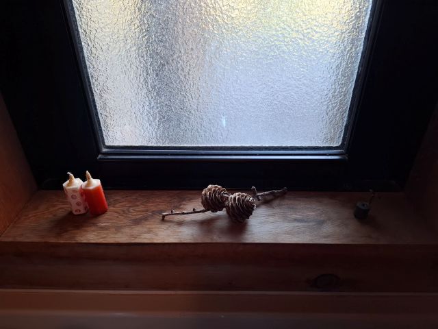 窓際は、町内の一本桜を見に行ったときに拾ってきたカラマツの実を飾っています。
