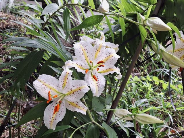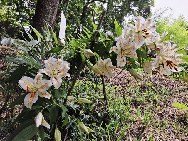 いつも通る路の脇に、山百合が咲いている。周囲の草取りや支柱などから、手をかけ、心をかけている人がいるのがよくわかる。立派な山百合だ。