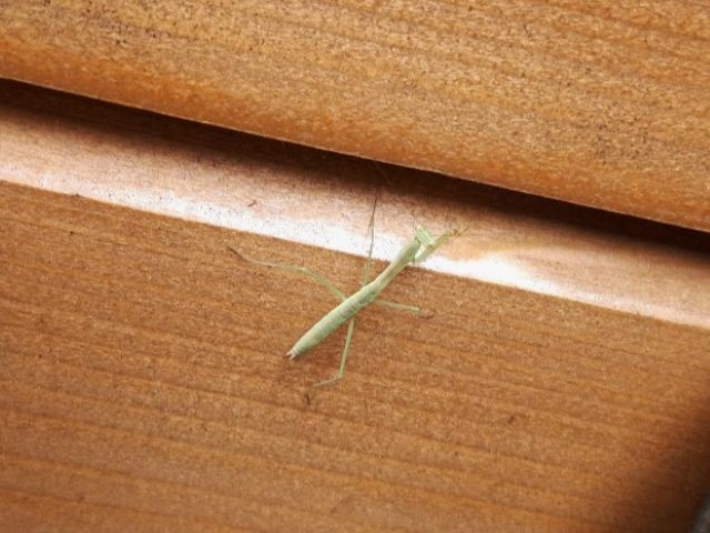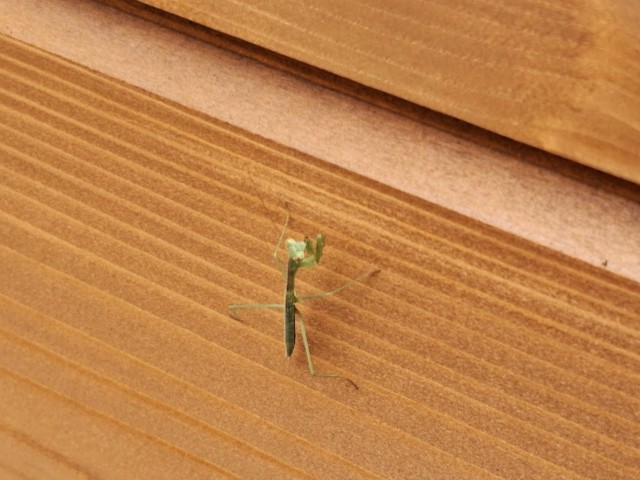 洗濯物を干そうと出たウッドデッキで、小さなカマキリを見つけた。生まれてまだ数日といったところか。身長(?)2㎝くらいだ。