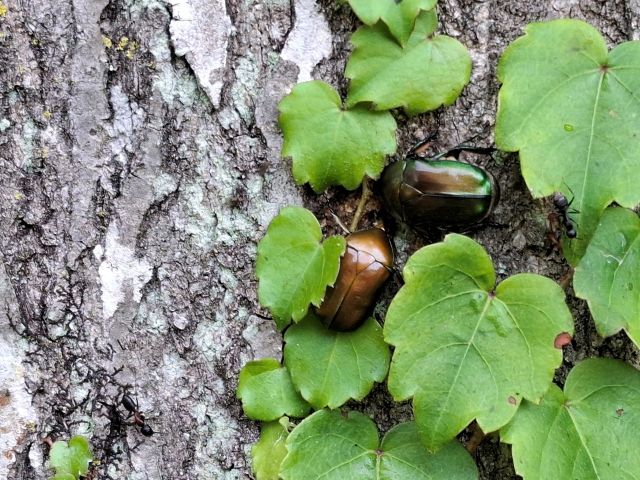 同じ木に、カナブンや蟻もたくさんいました。おいしい蜜が出ているのかな。「金亀子(こがねむし)」「蟻」は、夏の季語でした。