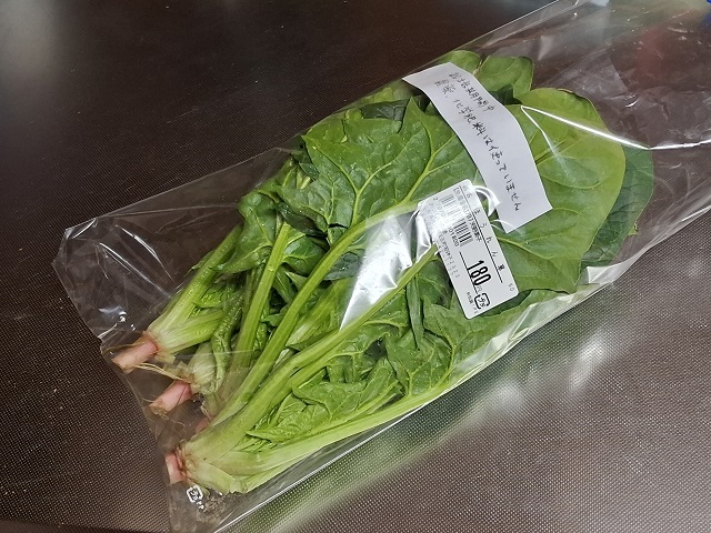 地もと生産者の野菜を売る「おいしい市場」で、無農薬のほうれん草を見つけた。