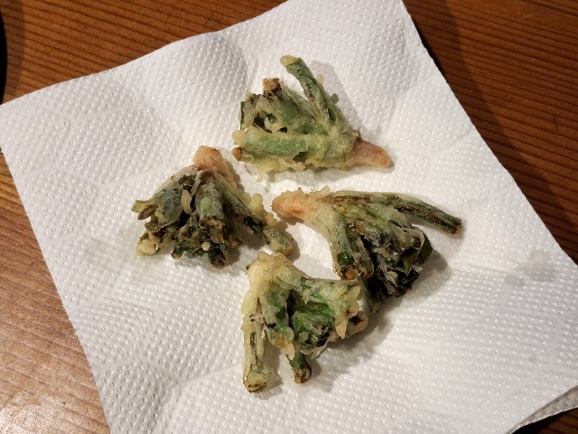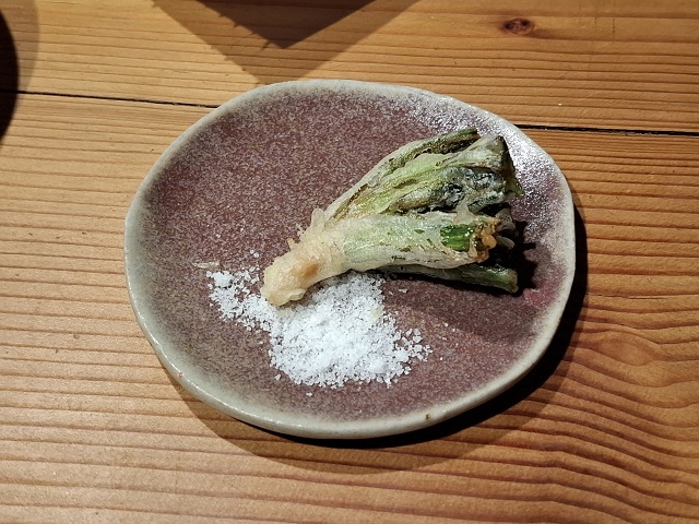 根っこを思う存分味わえるように、天麩羅にして塩で食べた。