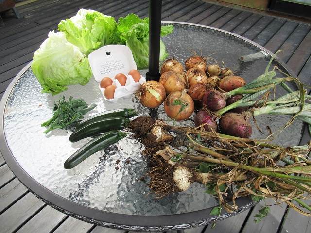 その日、近所の農家さんから野菜をいろいろいただきました。レタス、玉葱、赤玉葱、スティックセニョール、ズッキーニ、掘ったばかりのにんにくや玉葱も。