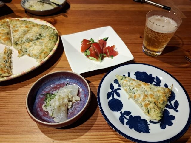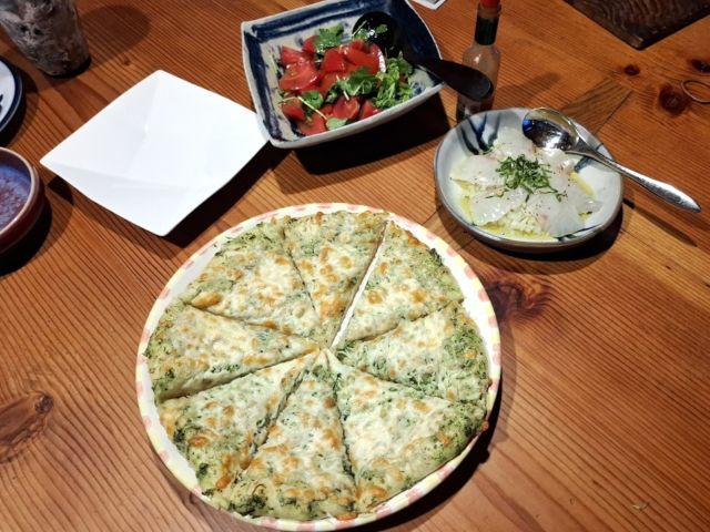 ジェノヴェーゼソースは、あっさりしたなかにおろしにんにくのパンチが利いています。わたしはタバスコなしで。トマトのパクチーサラダと白身魚のカルパッチョと。
