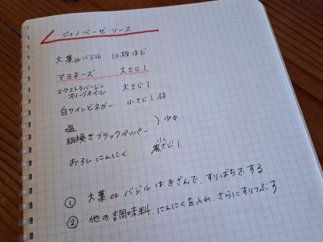 前回、ジェノヴェーゼソースのページをレシピノートにかき足していた。なので、作り方もすぐにわかる。
