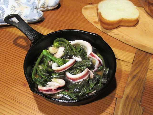 翌日のランチは、豚肉の残りでタラの芽のペペロンチーノ。