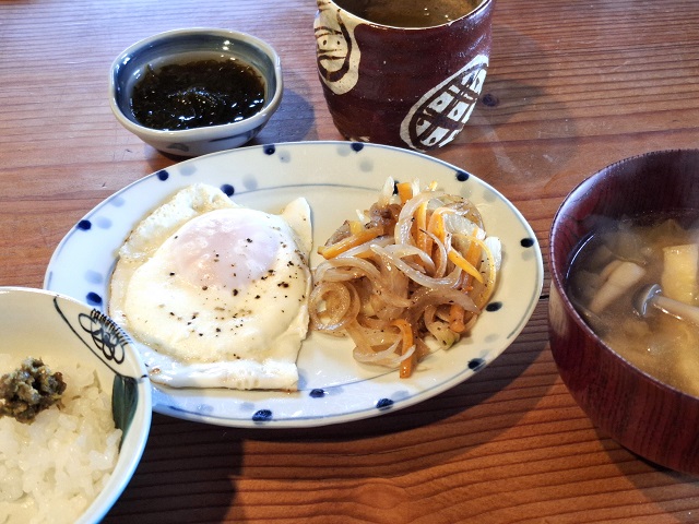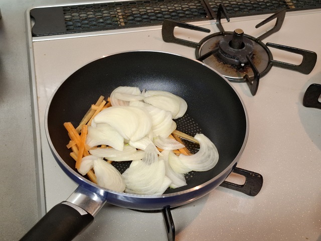 これは、我が家のキッチン。人参と玉葱の胡麻油炒め。わたしの料理の原点となった料理です。