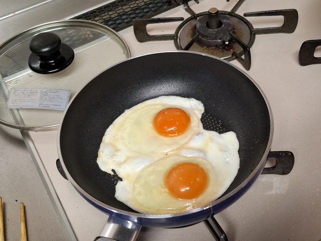 目玉焼き2つ焼くのに、直径20㎝はぴったりです。玉葱人参炒めの後、洗わずに使ってもこびりつくことなくストレスフリーでした。ガラスの蓋は、ずっと使っているもの。