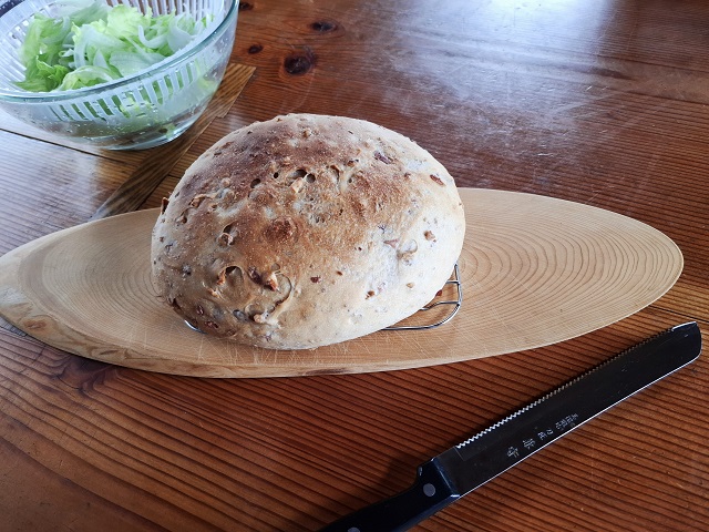 ウッドデッキで、簡単ランチ。膨らみすぎた分、ライトでふっくらした焼き上がりでしたが、本来の天然酵母パンの味わいにするには、発酵時間のしっかりした管理が必要かな。