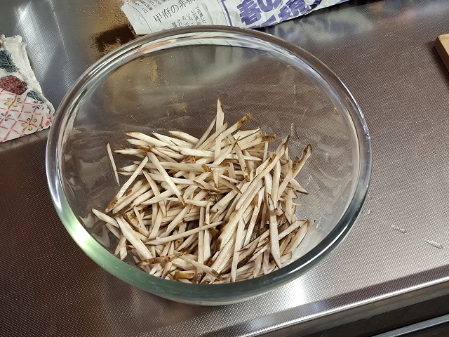 600Wの電子レンジで5分チンして、味噌風味の牛蒡サラダを。