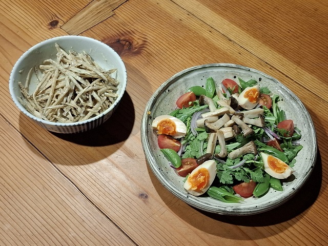 最近、キャベツやレタスの高騰で、葉物野菜のサラダが増えました。春菊とエリンギのサラダ。