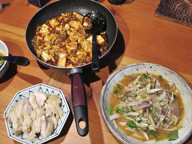 この日の夕餉は、併せて麻婆豆腐と蒸し鶏も作り、図らずも夫が作った日の献立と同じになった。