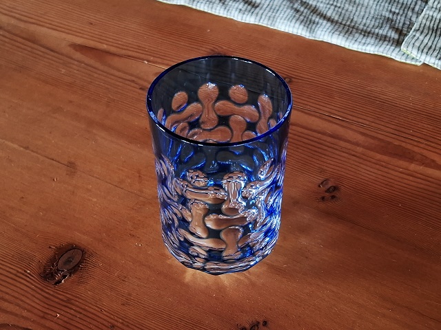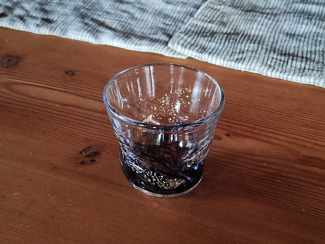こちらは、小樽で見つけたぐい呑み。たしか「大正硝子」で購入したと思います。角度によっては、黒にも紫っぽくもブルーにも見えます。