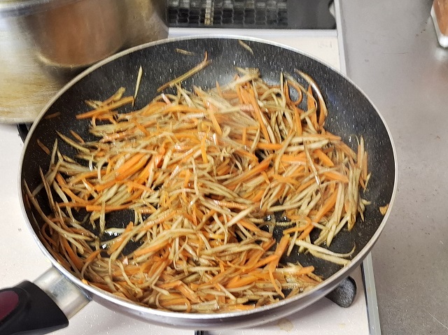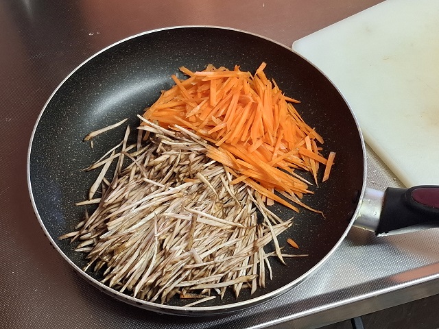 私は刻んだゴボウやニンジンを油でいためていたのですが、少しのお水をフライパンに入れてゴボウを入れ、そのお水で蒸し煮にし、それからみりんとお醤油で味付けをし、あらかた火が通ってからごま油を入れて炒めるという作り方でした。