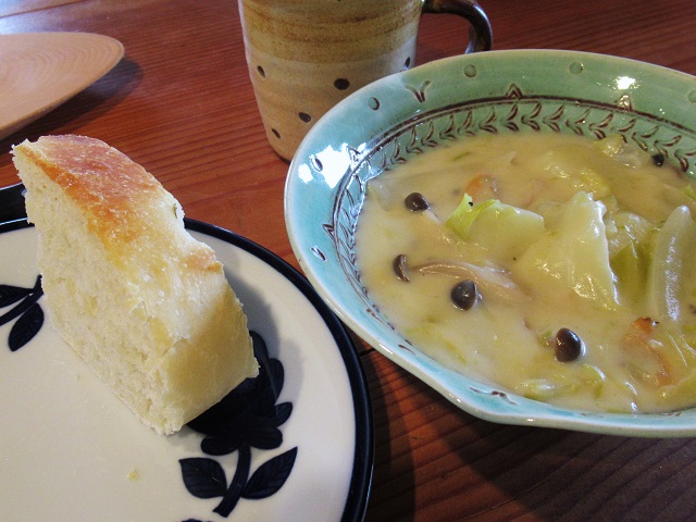 野菜庫整理も兼ねて煮たありあわせシチューとフォカッチャのランチ。