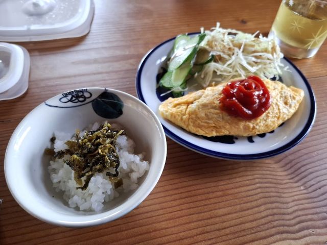 ボリューミーな挽肉入りオムレツランチにも、明太子からし高菜。