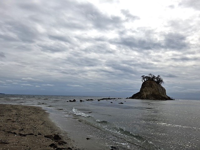 踏み石が並べられているため引き潮の時間帯のみ、島の近くまで歩いていくことができるそうです。近くで見ると、岩肌が崩れているのがわかります。形も変わってしまったのでしょう。