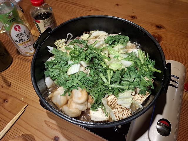 春菊を入れてひと煮立ちしたら、食べ頃です。