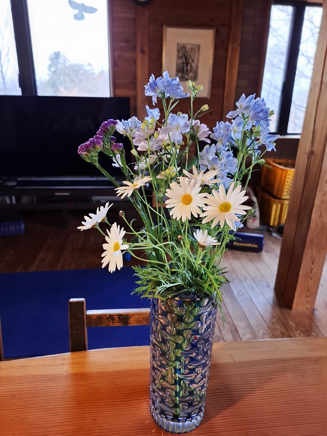 ご主人が生けてくれた切子の花器いいですね。
