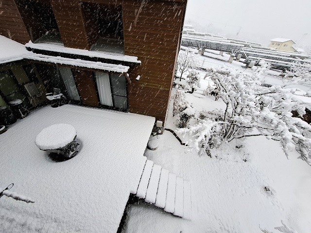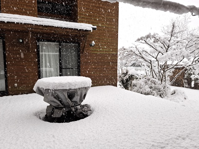 ウッドデッキのテーブルが、積雪の目安になっています。