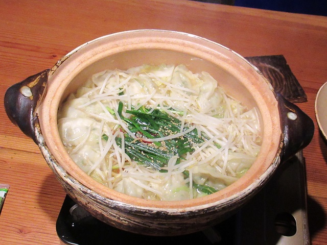 2日目。白菜、もやし、ニラ&餃子の鍋。鶏ガラスープが利いています。見た目、モツ鍋風ですね。