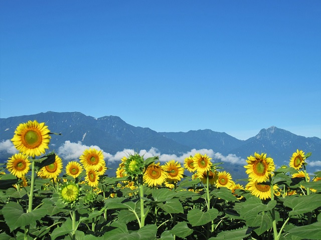 夏山は霞むことが多く、ひまわりと山々のコラボ写真はなかなか撮れなくて、貴重なショットです。