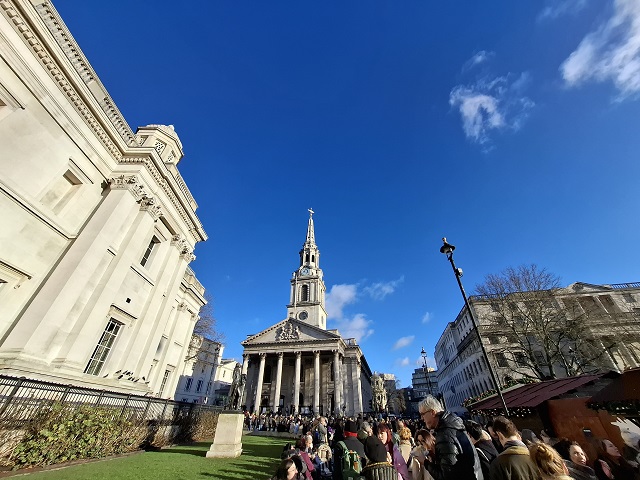 トラファルガー広場は、ものすごい人。左がナショナル・ギャラリー。正面は、セント・マーティン・イン・ザ・フィールズ教会。
