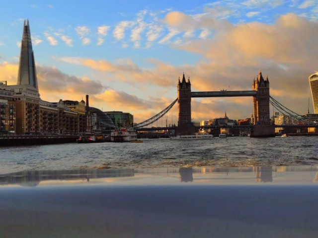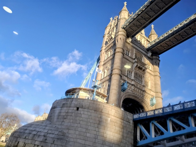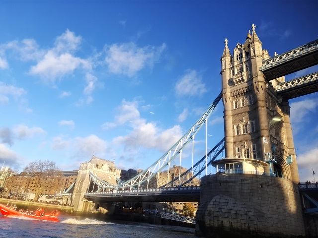 それでも、窓際に座った船内は暖かくホッとひと息つき、デッキに出れば川面を流れる風は心地よく、下から眺めたタワー・ブリッジは、迫力満点だった。