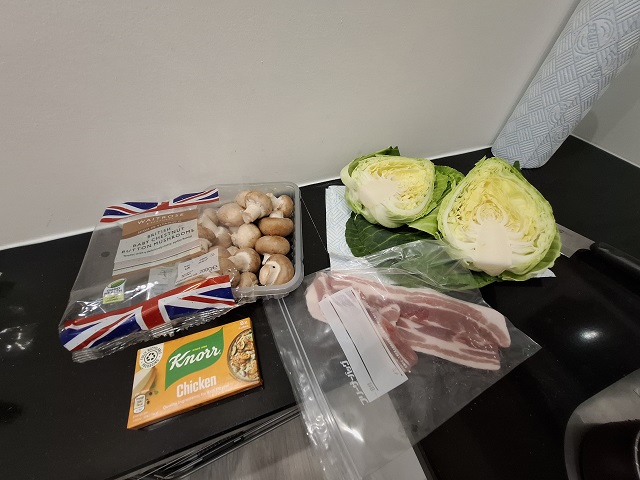 ラストナイトは、自炊しました。まな板がなかったので、キッチンペーパーとキャベツの皮で代用。