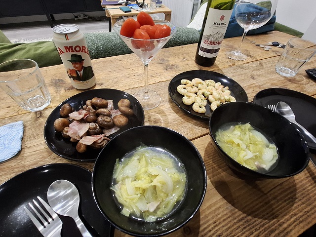 旅行中は野菜の摂取量が減るので、スープをたっぷり煮ました。マッシュルームは、日本で売っているものと歯ごたえが違い、しっかりしていて美味でした。