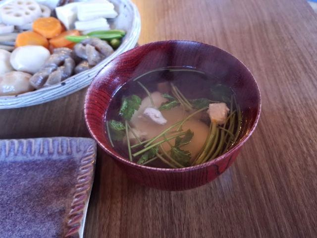 お雑煮は、おすましに鶏肉、三つ葉、柚子のシンプルなもの。
