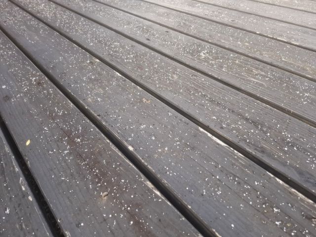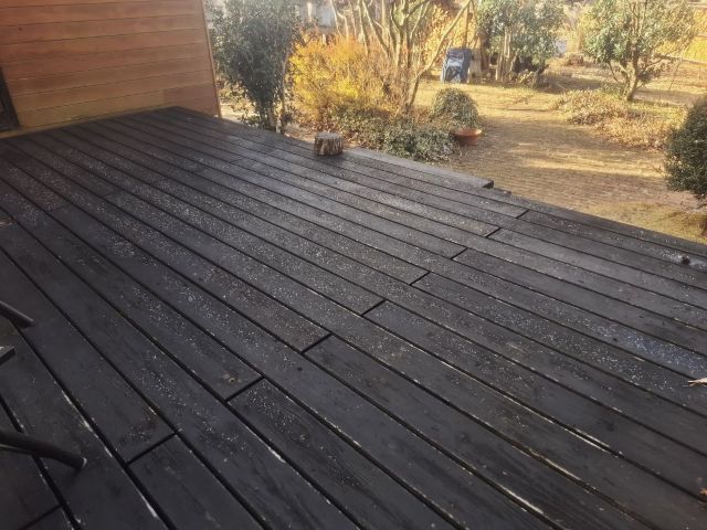 ウッドデッキの上には、凍って残った雪が。