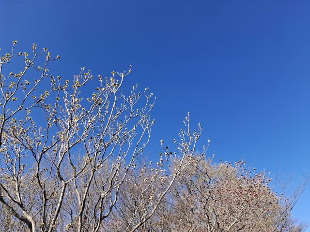 鳥たちの写真は撮れなかったので、芽吹き始めた木々の上枝(ほつえ)を。