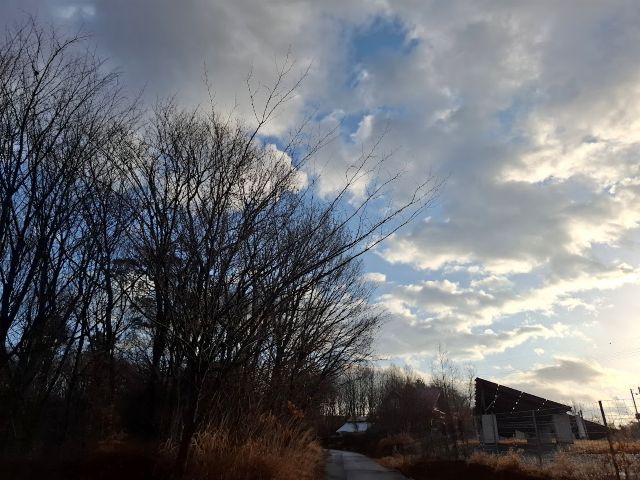朝7時半、新聞を取りに行ったとき。家の前の道の東側の風景。雨上がりの空。