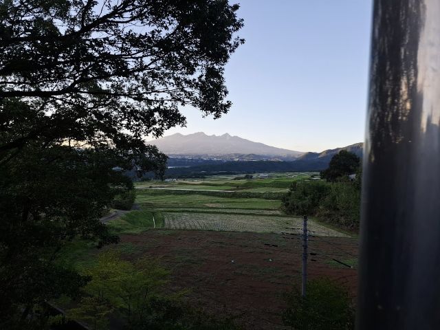 夕刻、ベランダから見た煙突(右の光ってるやつ)越しの八ヶ岳。熱いレモンジンジャーティーが合うような、肌寒さでした。
