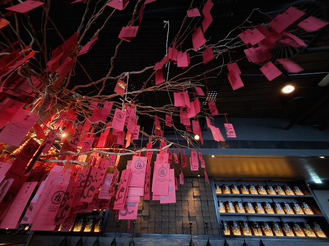赤い札をディスプレイした木の下で、食事しました。