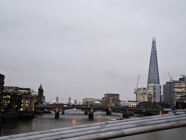 右のとんがったビルが「ザ・シャード」です。テムズ川。向こうには、霧雨のなかタワー・ブリッジが見えています。
