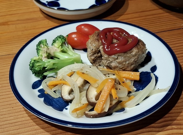 塩小さじ1で作ったハンバーグ(合挽き肉300g)と、塩ひとつまみ×3の玉葱と人参と椎茸の炒め物(小さいフライパン一杯)。