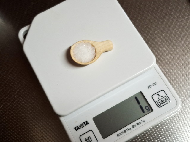 量ってみました。ひとさじだと1gですが、2さじだと3gになるので1.5gと判定しました。