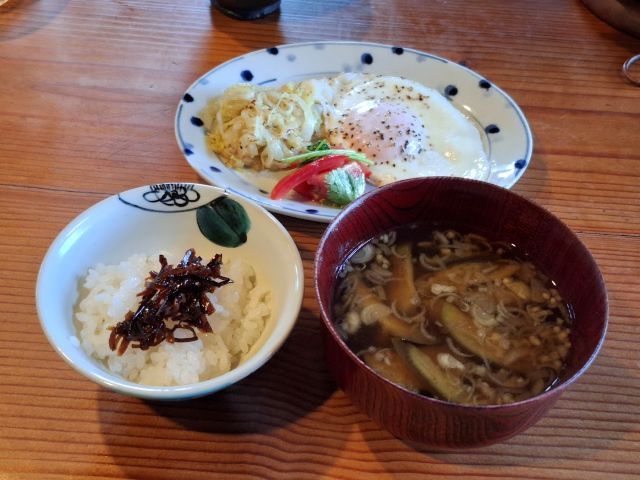 胡麻油で炒めた茄子と茗荷のお味噌汁。この具の組み合わせが、お味噌汁のなかでいちばん好き。