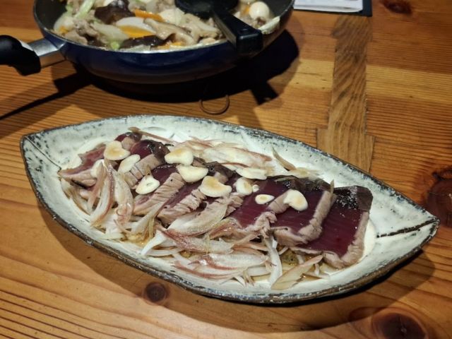 鰹の叩きと五目焼きそばの夕餉。玉葱と茗荷とスライスしたにんにくを散らしてみました。