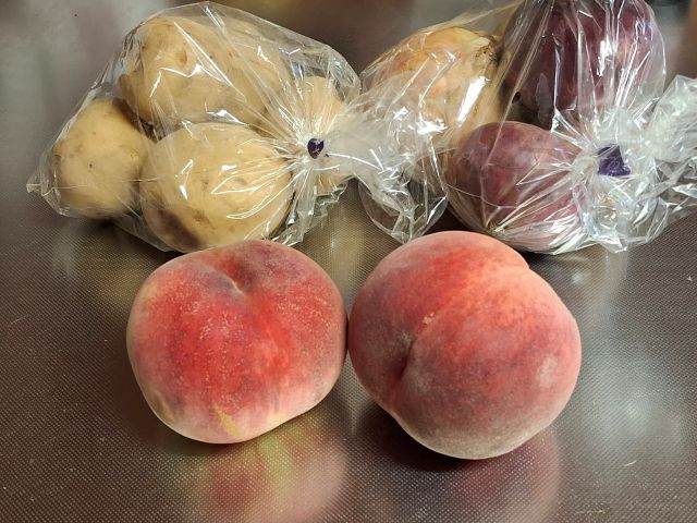 じゃが芋、玉葱、ひと袋100円。はねだしの桃、2個300円を購入しました。