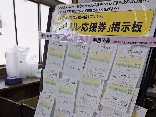うまく撮れなかったけど、「ハピリレ応援券」掲示板です。