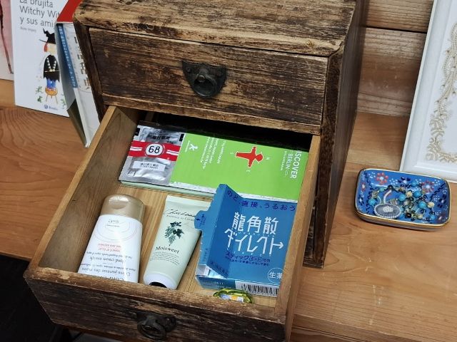 「ふるものや」さんの卓上抽斗の2段目には、ハンドクリームやリップクリーム、目薬、龍角散、芍薬甘草湯などの身体をケアするものが入っています。